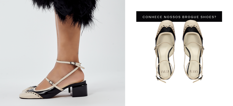 Emma - Scarpin slingback - Couro preta com couro off white O slingback brogue Emma está desenvolvido em couro e tem seus detalhes perfurados no clássico estilo inglês. Aqui o design clássico ganha um toque moderno com a aplicação da tira abotoada no tornozelo....