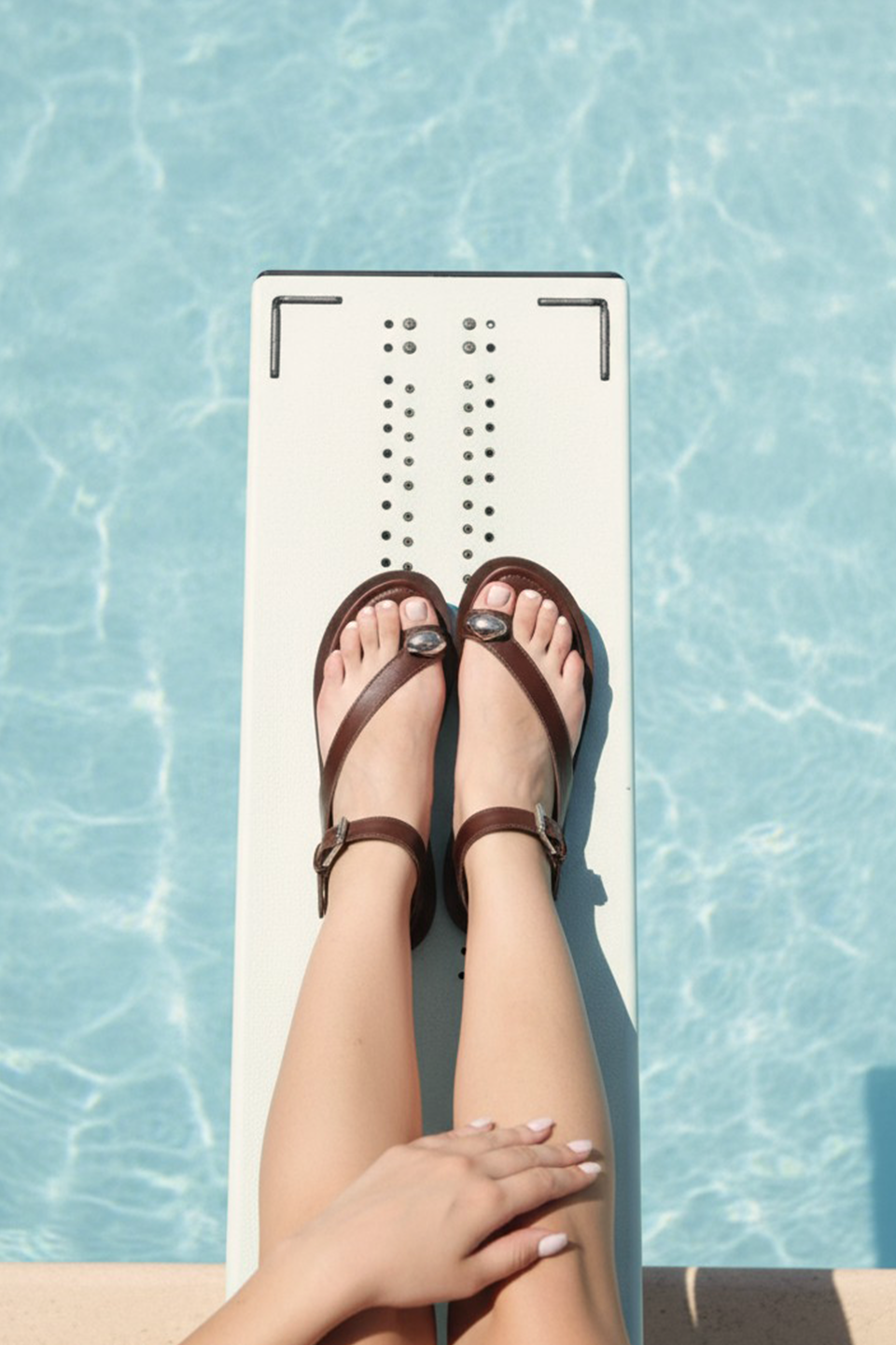 As tiras assimétricas reforçam a estética limpa e elegante.