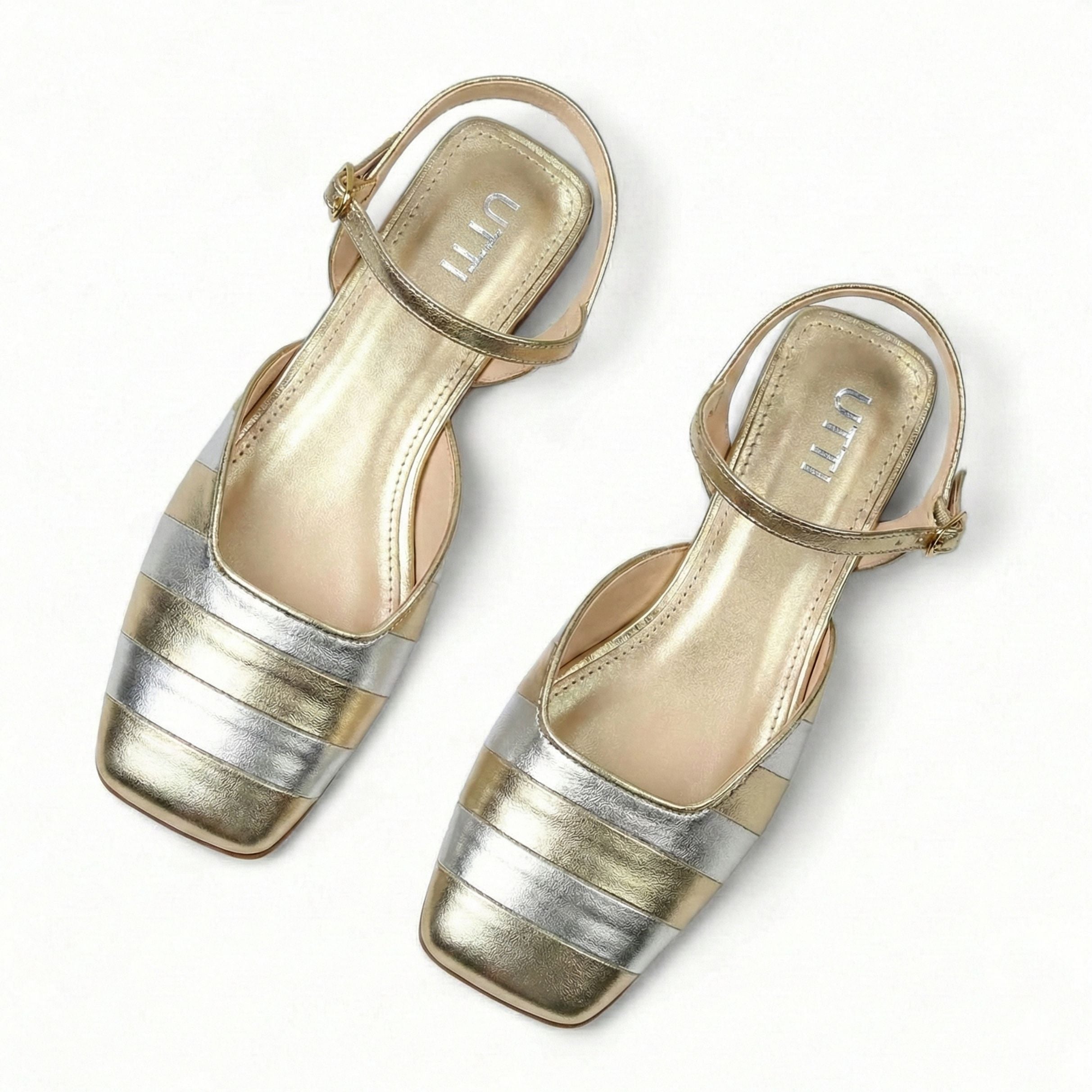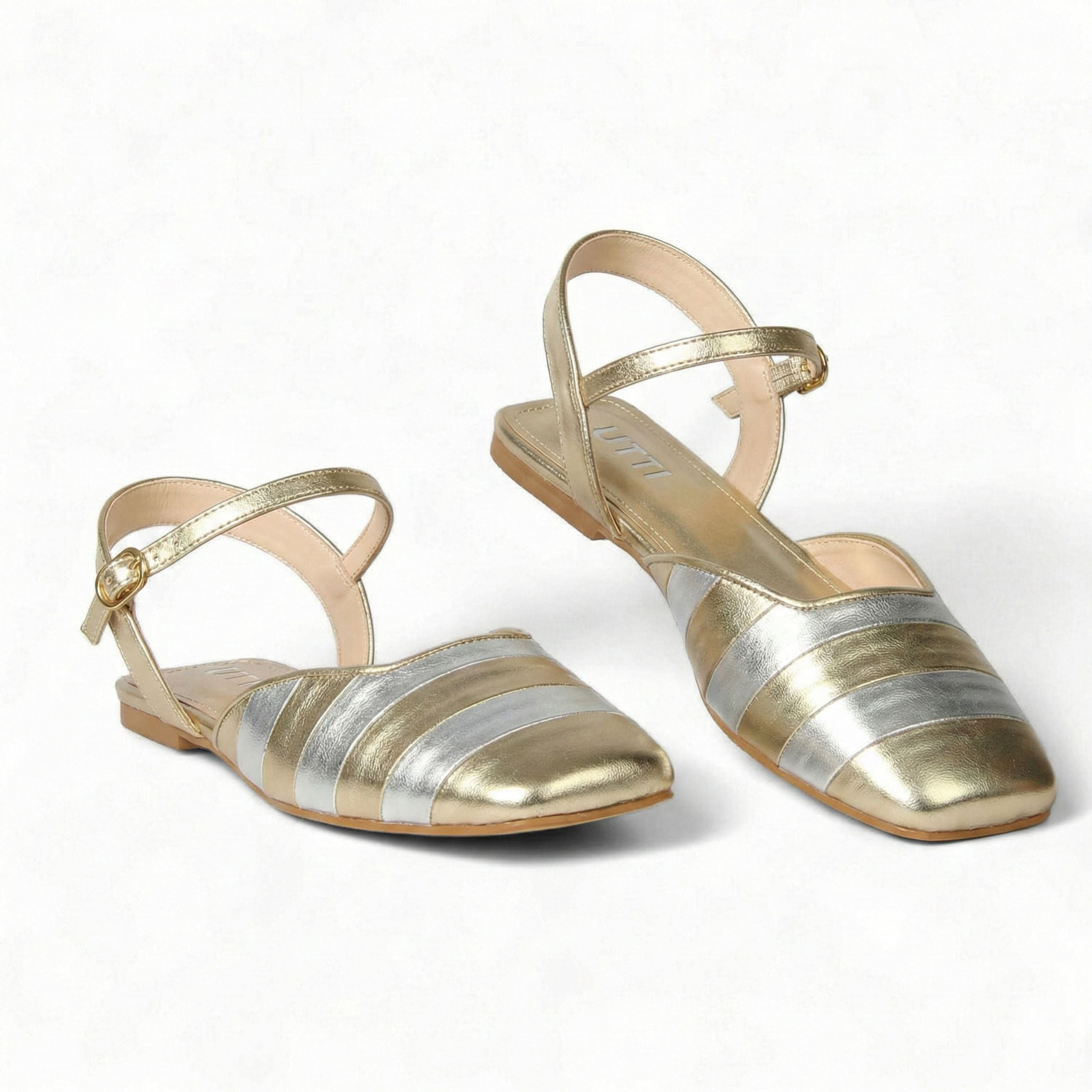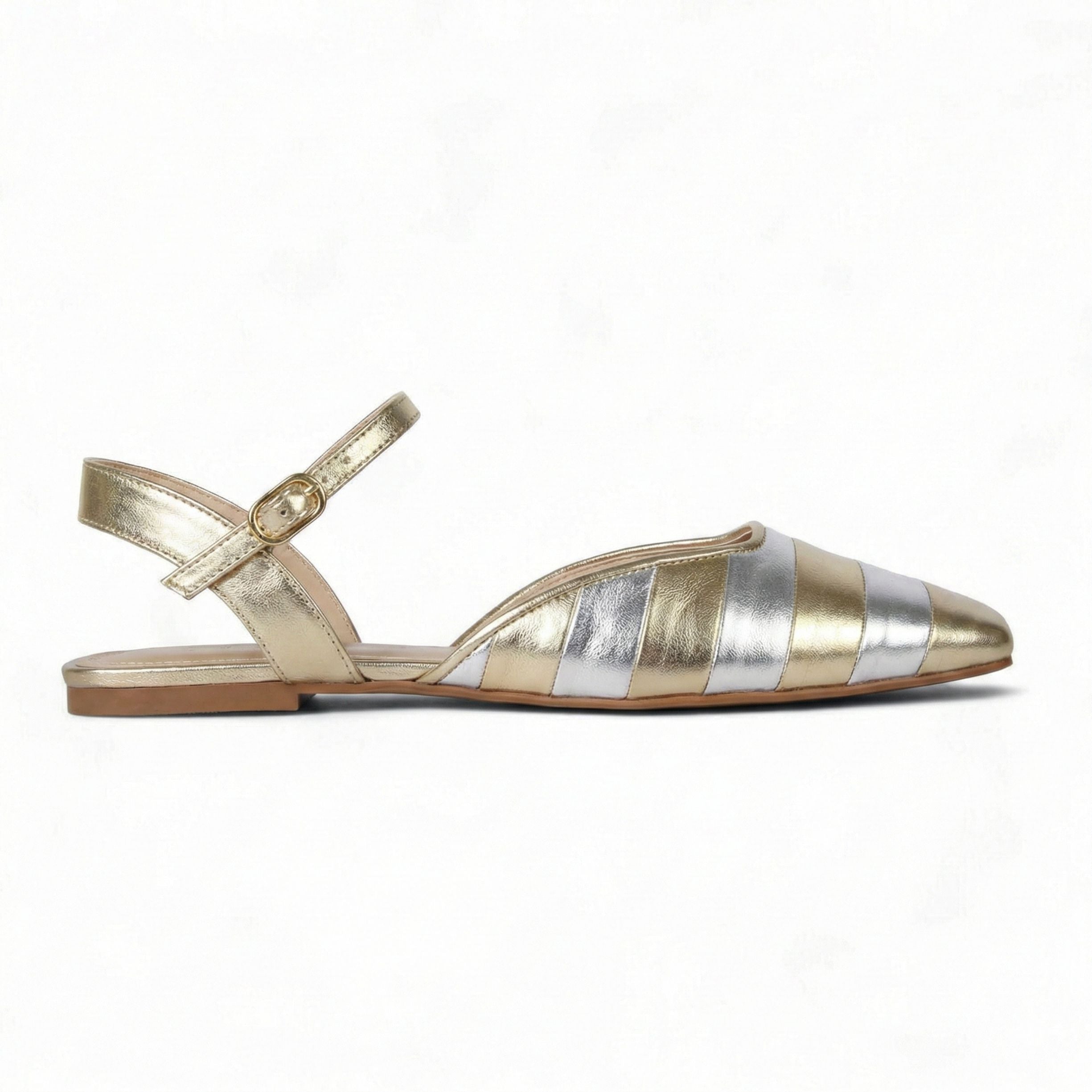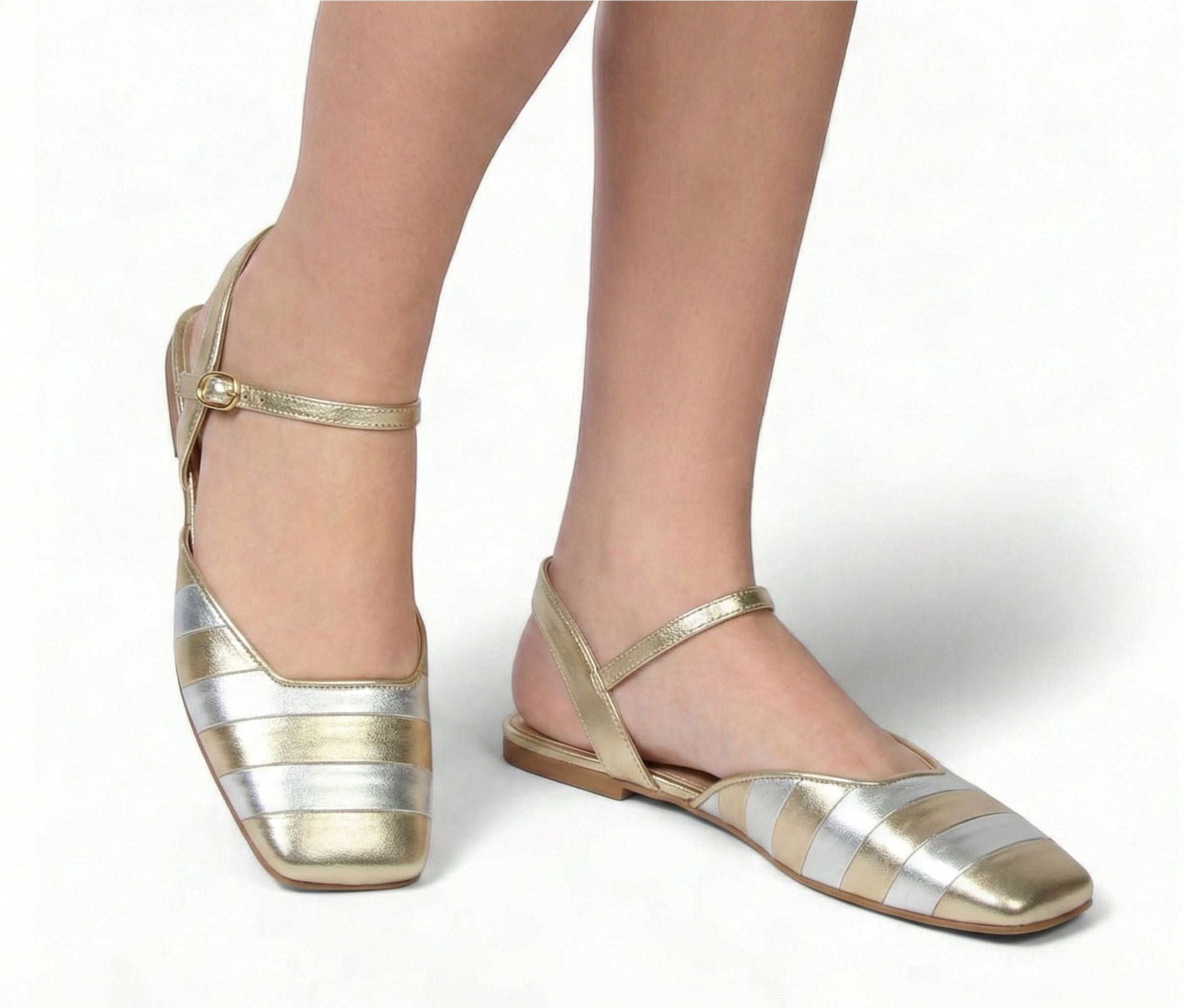 O mix de caramelo com dourado e prateado é uma aposta certeira da temporada — sofisticado, luminoso e atemporal. Essa sapatilha é ideal para quem busca um calçado curinga, capaz de elevar qualquer produção com elegância natural, seja para o dia a dia, encontros especiais ou viagens.