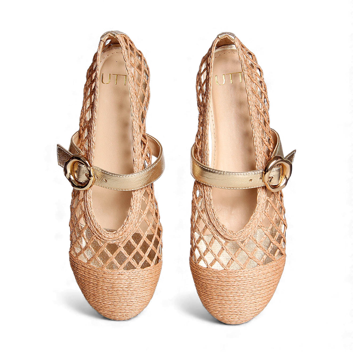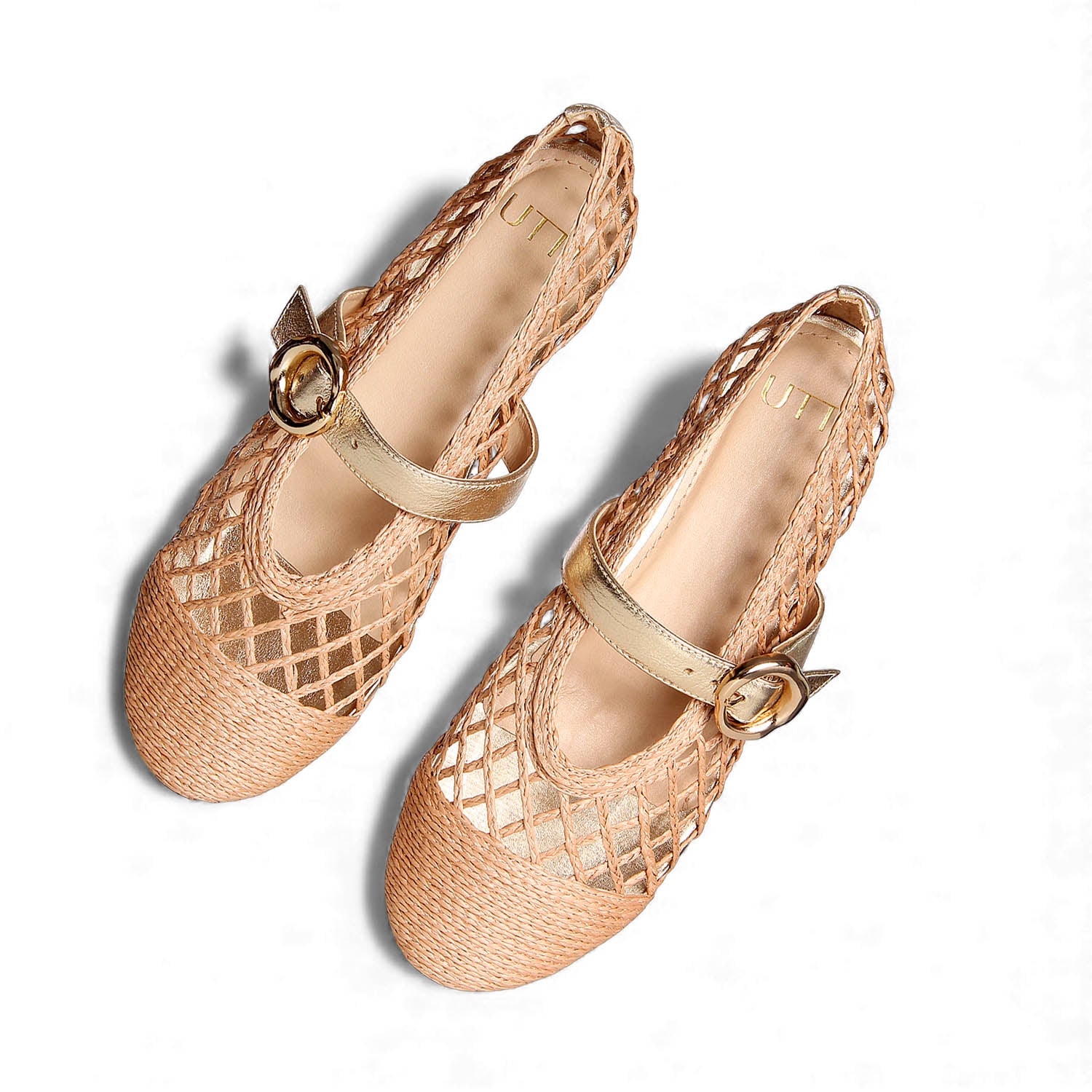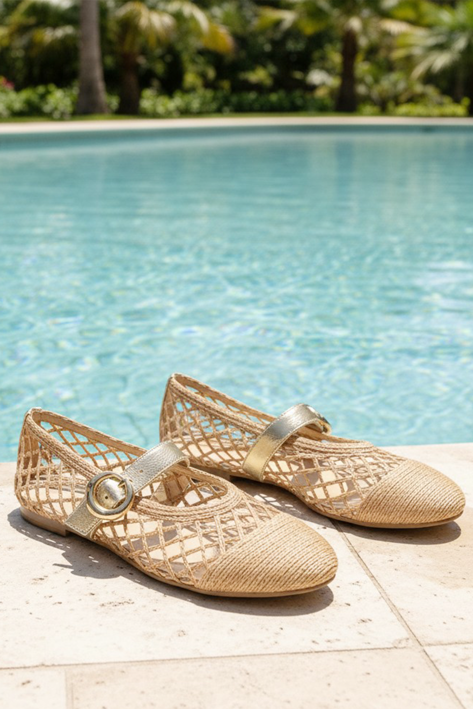 Com construção artesanal, bico texturizado, corpo vazado e tira dourada com fivela moderna, o modelo equilibra design contemporâneo e materiais naturais de forma sofisticada e atemporal.