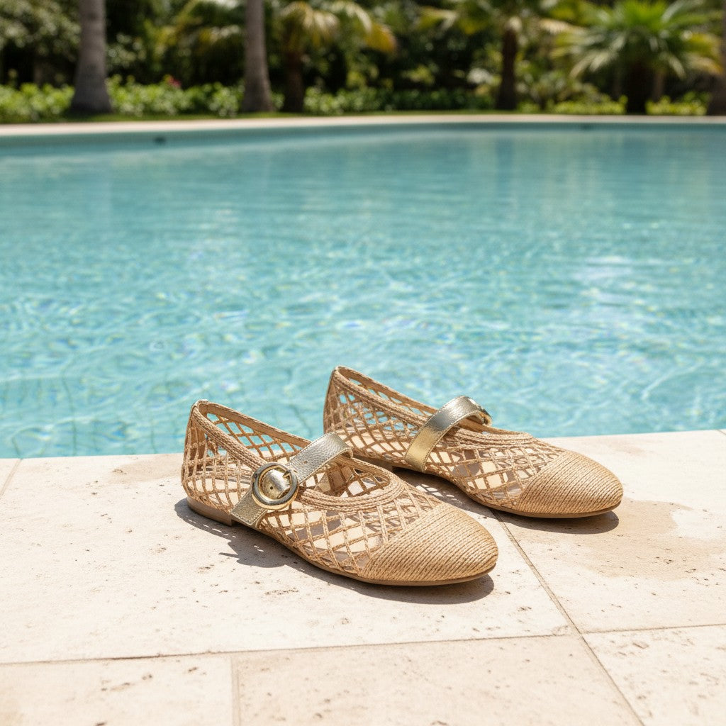A Maia apresenta um trançado vazado que envolve o pé com naturalidade, criando um visual leve, respirável e extremamente confortável.