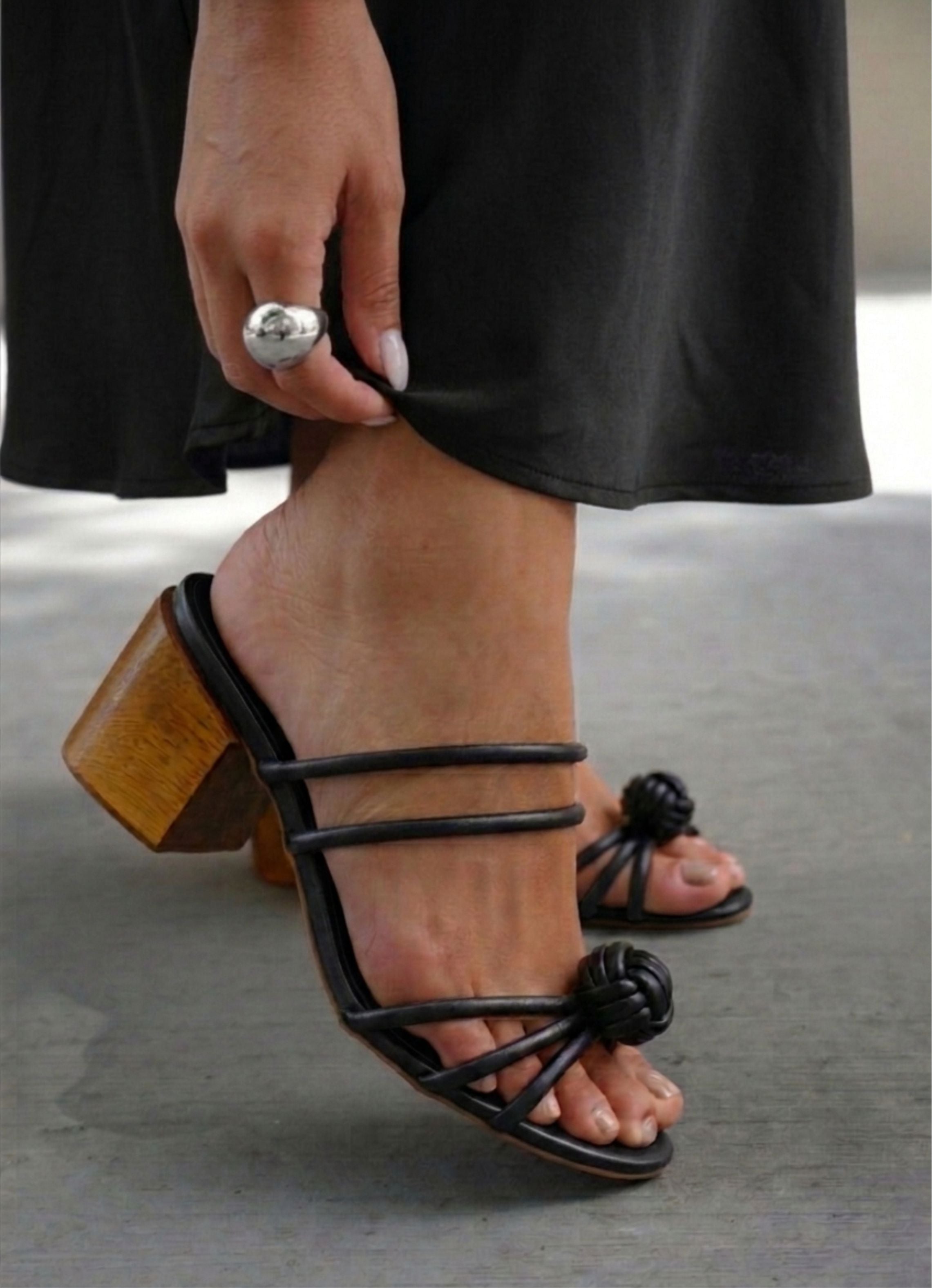 A construção da Aura une tiras finas em couro preto com acabamento impecável, criando um visual leve, sofisticado e feminino. O nó frontal escultural funciona como destaque do design, adicionando charme e presença ao modelo. O salto bloco em madeira traz um contraponto natural e refinado, proporcionando equilíbrio visual e conforto ao caminhar. A combinação dos elementos resulta em uma sandália elegante, atemporal e versátil para diversas ocasiões.